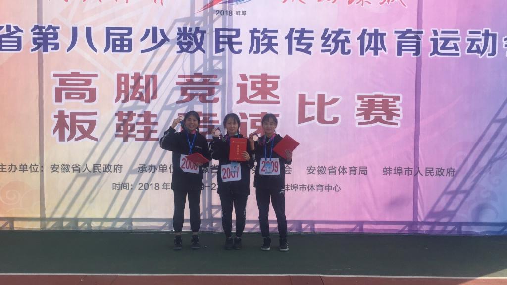 11月19日至23日,由安徽省人民政府主办的我省规模最大、规格最高的少数民族体育盛会--安徽省第八届少数民族传统体育运动会在蚌埠市体育中心隆重举行,bv1946伟德运动健儿在许贵泉、胡哲纯两位教练的带领下,代表安庆市参加了板鞋竞速和高脚竞速两个项目的比赛。经过激烈角逐,bv1946伟德健儿战果丰硕,最终在高脚竞速男子女子100米、200米、2×200米、4×100米混合接力等项目中获得一等奖三个;二等奖五个,三等奖二个。在板鞋竞速60米、100米、2×100米等项目中获得二等奖二个、三等奖一个。