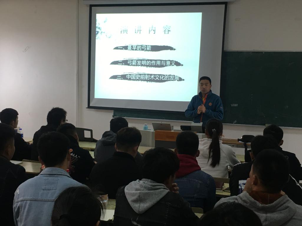 11月17日下午,伟德国际victor·1946源自陈光华副教授在龙山校区体育馆多媒体教室为该院2016级、2017级休闲体育专业学生作题为“史前射术文化”的学术报告。