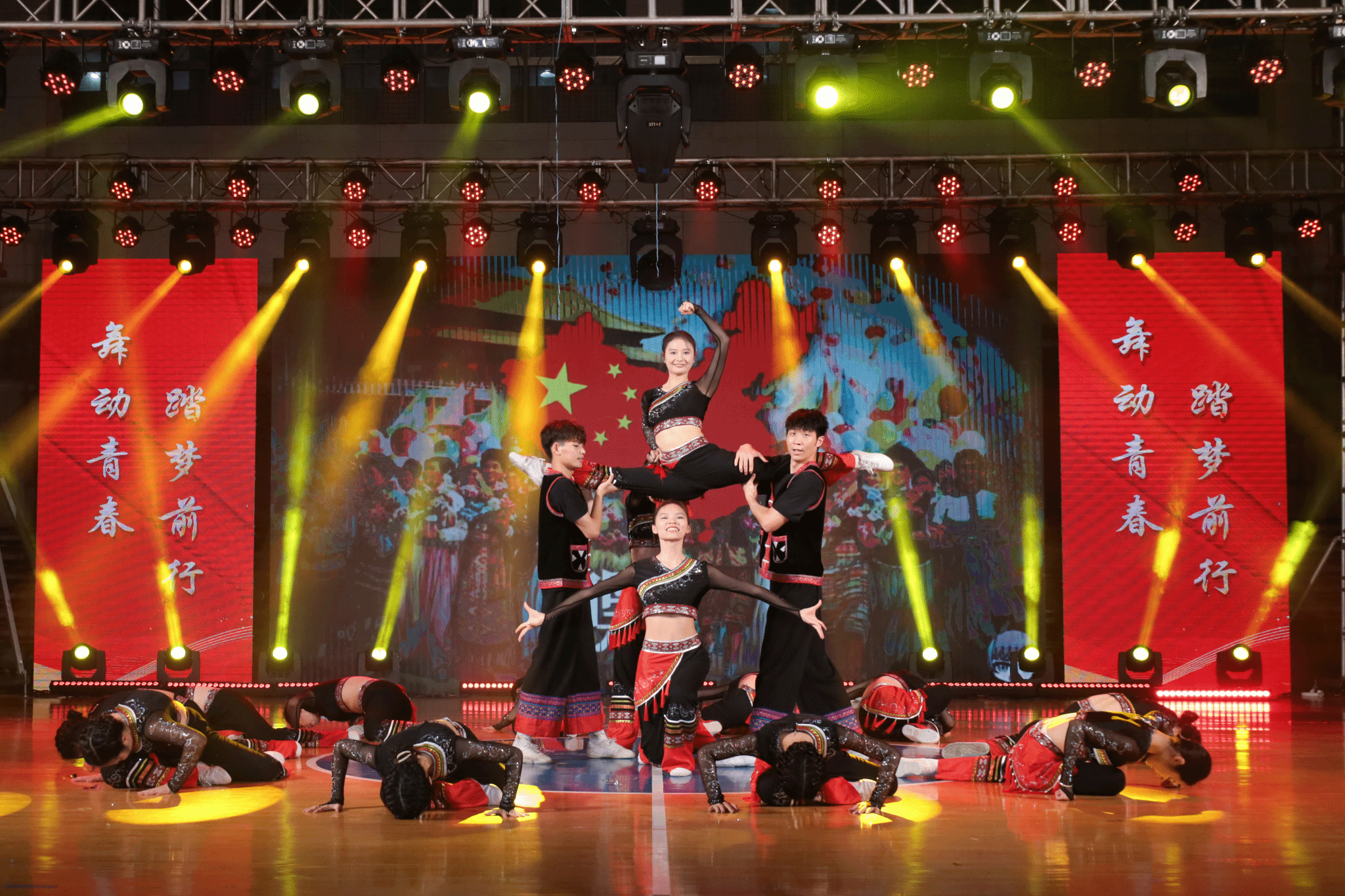 晚会在《红旗飘飘》舒展大气的拉丁团体舞中拉开序幕,舞者们运用舞蹈的力量展现红旗飘飘背后的深意与骄傲,诠释着与众不同的花样年华。舞蹈《沐光而行》《炽热》《我们的时光》《舞林外传》述说青春是一曲荡气回肠的歌,充满欢笑与泪水,年少的梦像风,呼啸而来,自由自在,无惧无忧;青春是一片轻盈柔美的云,满载希望与梦想,留下最隽永的回忆和最美好的瞬间。