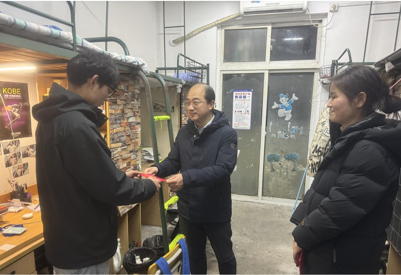走访过程中,王玮代表学院为留校学生送上了新春祝福与慰问红包,详细询问了留校学生的学习和生活情况,叮嘱同学们留校期间要提高个人安全意识,重视日常生活安全,遵守宿舍管理规定,注意劳逸结合,保持身心愉悦。他强调,同学们在校要互帮互助,遇到困难及时联系辅导员老师,学院将切实帮助同学们解决问题。