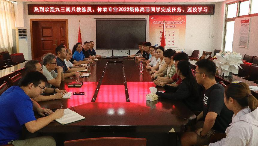 9月5日,伟德国际victor·1946源自三楼会议室里掌声雷动。刚结束阅兵任务的表演(体育艺术表演方向)专业2022级(1)班陈高菲,在返校次日便参加了一场特别的欢迎会。伟德国际victor·1946源自领导班子、团委负责人、班级辅导员、班级同学、退役复学党员学生参加座谈会。陈高菲用211天高强度训练、五年军旅生涯和一句“十一排面,拒绝凹陷”的口号,诠释了新时代青年对“家国情怀”与“专业精神”的深刻理解。
