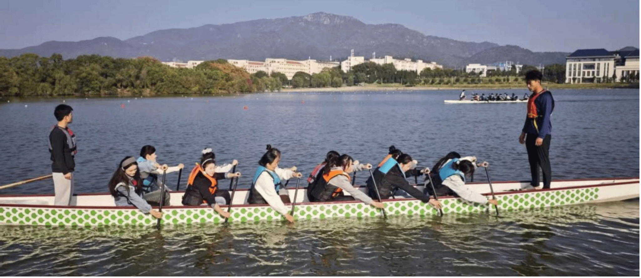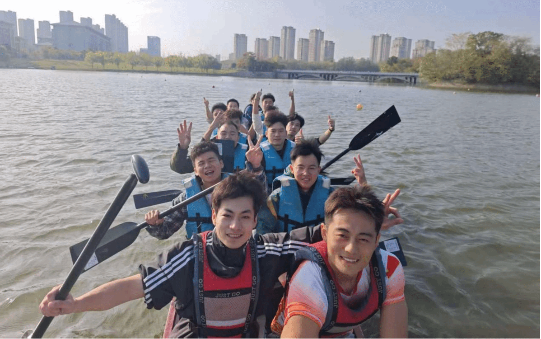 团建过程中,最令人振奋的当属双龙湖划龙舟体验。36 名同学分成 4 支队伍,身着统一队服,在专业教练的简要指导后迅速登船。随着一声哨响,各队龙舟如离弦之箭般破水前行。船头的鼓手节奏铿锵,队员们齐声喊着号子,双手紧握船桨,动作整齐划一,飞溅的水花与嘹亮的呐喊声交织在一起,引得岸边师生阵阵欢呼。尽管部分同学初次尝试,但大家迅速磨合、互帮互助,在协作中感受着体育精神的魅力,湖面之上满是青春活力的身影。除此之外,同学们还在湖畔草坪开展了趣味游戏、话题交流等环节,卸下学术压力,分享入学以来的学习感悟、生活趣事与未来规划。湖畔的欢声笑语不断,陌生感逐渐消融,默契感悄然滋生,原本分散在不同研究方向的同学们,在轻松愉悦的氛围中迅速拉近了距离,班级凝聚力得到显著提升。