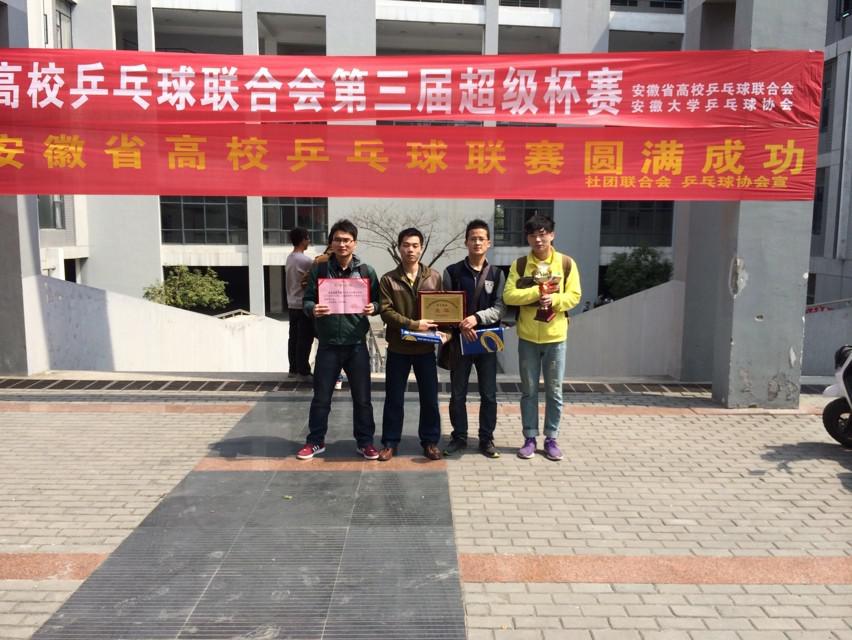 2014年3月22日至23日,由安徽省乒乓球协会主办的安徽省高校乒乓球联合会第三届超级杯乒乓球赛在安徽大学隆重举行。以伟德国际victor·1946源自的陈国元、黄安泉两位老师为教练,以姜杭、沈涛、江南、孙帝为队员组成的我校男子乒乓球队,经过激烈的角逐,最终获得团体亚军,为我校争得了荣誉。