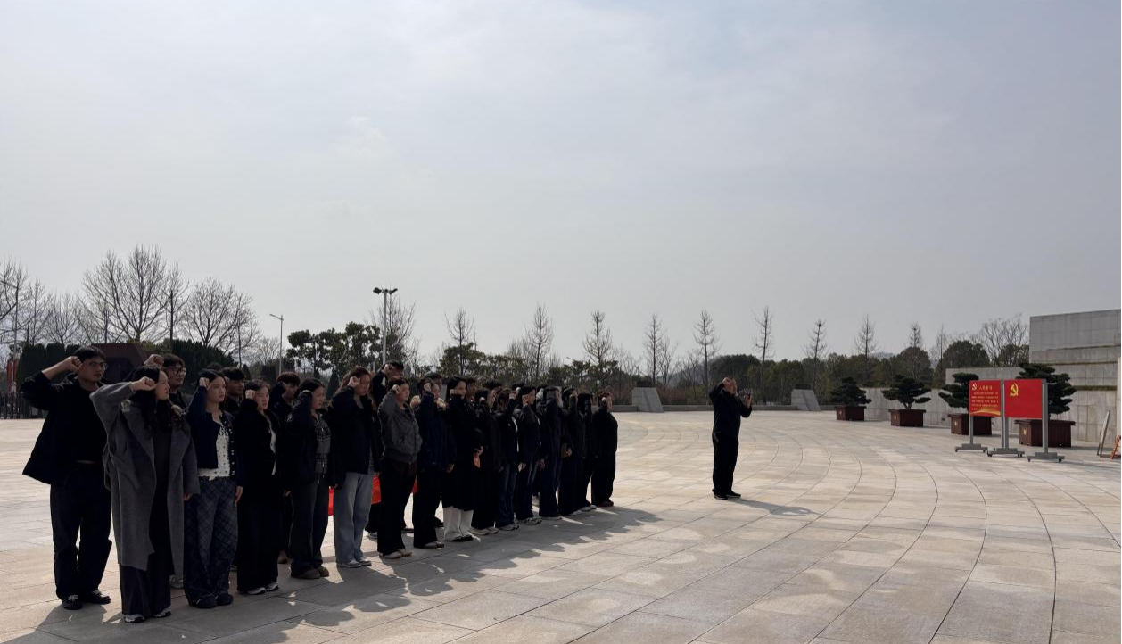 下午2:00,学校南大门红旗招展,党徽闪耀。同学们身着整洁盛装,精神抖擞,在班委的有序组织下领取徽章。我们还邀请到了辅导员程启平老师一同出席,师生并肩,共同拍摄了一张充满师生情谊与责任担当的合影,定格下青春与信仰交织的瞬间。片刻的宁静后,队伍整装出发,奔赴一场与英烈的对话。