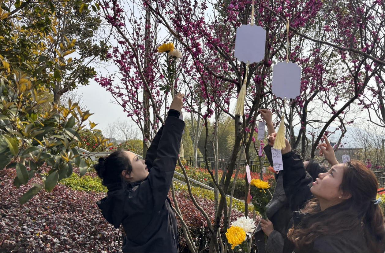 祭扫之余,班级开展了“寄语英烈”志愿行动。同学们提笔在心愿卡上写下对先烈的崇敬之情,更写下属于新时代青年的青春誓言。一张张心愿卡被精心悬挂在紫荆花枝头,春风拂过,卡片轻扬,思念与信念也随春风传递,化作砥砺前行的力量。