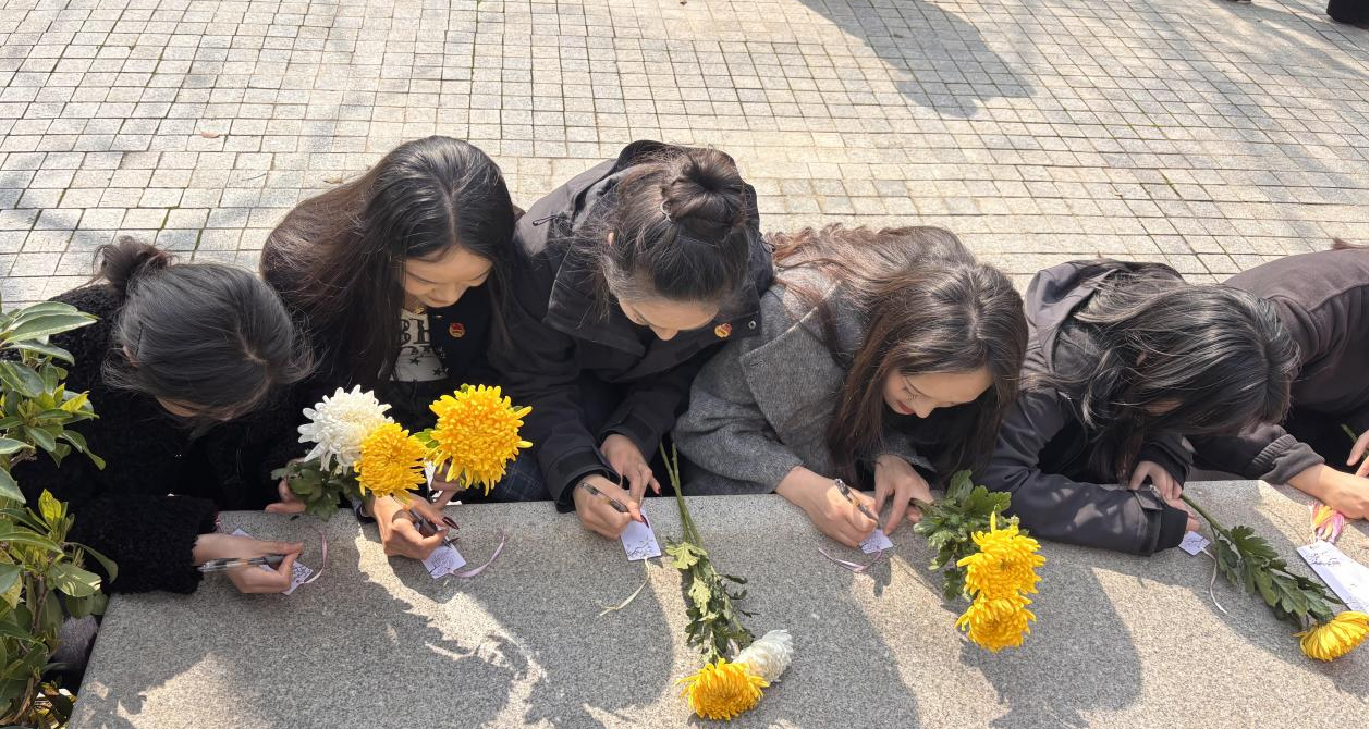 随后,同学们手持菊花,依次缓步走到烈士墓前与纪念碑下,轻轻放下手中的花束。洁白与金黄的菊朵,寄托着对革命先辈的无限哀思,更承载着后辈学子对英烈的崇高敬意。