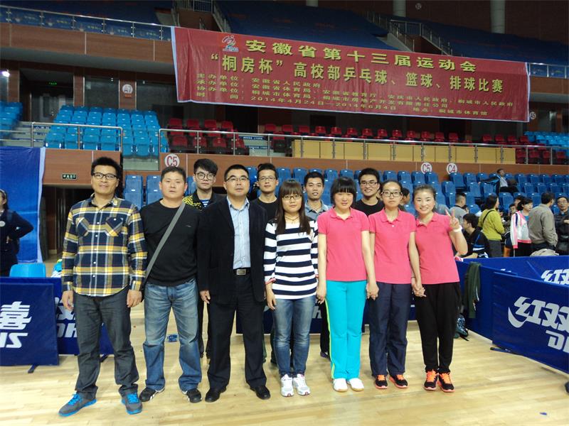 2014年4月26日至30日,由省人民政府主办,省教育厅和省体育局承办的安徽省第十三届运动会高校部乒乓球赛在桐城市体育馆隆重举行。我校派出了以伟德国际victor·1946源自副院长、校体艺委常务副主任章翔为领队,以伟德国际victor·1946源自陈国元、黄安泉两位老师为教练,以来自全校六个学院的四名男同学和四名女同学为队员的代表队参加了此次甲组比赛。最终经过五天的激烈角逐,我校代表队取得了骄人的战绩。