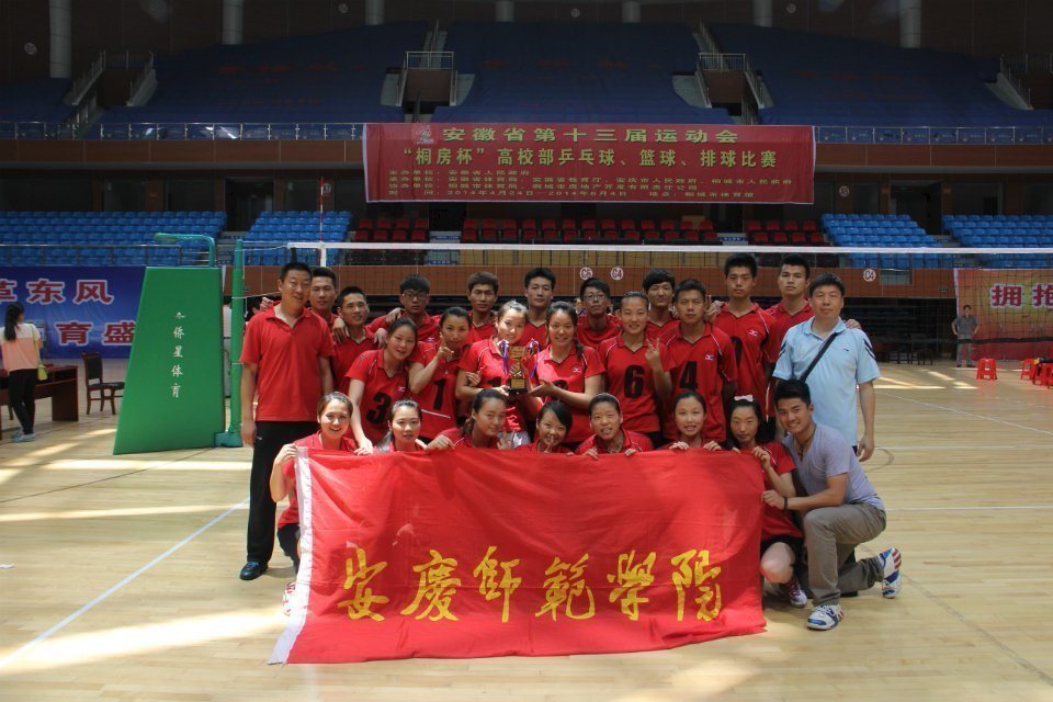 6月2日,安徽省第十三届运动会高校部排球赛在桐城市体育馆落下帷幕。我校排球队在李斌、邓龙和闻又文等老师的带领下,首次组队参加了此次安徽省体育界最高水平的竞赛。最终我校排球队了取得了历史性的突破,不但获得了女子丙组季军和男子丙组第四名;而且女子甲组排球队还荣获了大会组委会颁发的“体育道德风尚奖”。