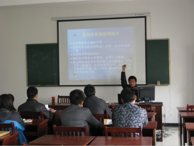 2013年4月18日至21日,安庆市体育局和市篮球协会在安庆电力工业学校举办了安庆市篮球裁判员培训班。我院宣暄、贾恩峰两位老师应邀为本期培训班的学员分别作了题为《裁判员临场技巧》、《如何正确判罚违例和犯规》、《篮球竞赛组织与编排》、《如何提高篮球执裁水平》等专题讲座。