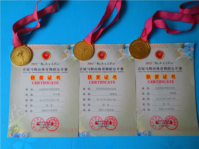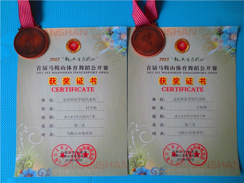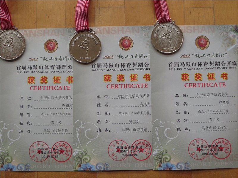 6月2日,安徽省第一届“甄山杯”体育舞蹈公开赛在马鞍山市体育馆隆重举行。我校体育表演专业学生在潘磊老师的带领下,经过精心准备和顽强拼搏,在本次比赛中获得了优异成绩。其中,我院体育表演专业2011级的李霜霜、徐梦瑶和付宇航同学分别获得了成人女子单人A组拉丁舞第一名、第二名和第三名;体育表演专业2011级的徐梦瑶和程飞红同学分别获得了成人女子单人B组拉丁舞第一名和第二名;体育表演专业2011级的付宇航、李霜霜和2009级的王海燕同学分别获得了成人女子单人C组拉丁舞第一名、第二名和第三名。