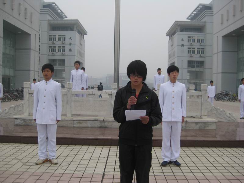 7点30分, 升旗仪式正式开始。伴随着雄壮的国歌声,鲜艳的五星红旗在微风中冉冉升起,随风飘扬。我院2011级全体同学面向国旗肃立行注目礼,用心感受着国旗升起的庄严时刻。升旗礼毕,我院2011级学生代表孙凤华同学做了以“祖国在我心中”为题的国旗下发言。她号召全体同学坚定心中的信念,站在新的起点,向着新的方向,扬帆起程,带着希望义无反顾地奋勇前进;维护国家与民族的团结和统一,为建设特色社会主义事业贡献自己的力量。随后,2011级学生代表郑杨扬同学带领全体同学举起右手庄严宣誓:作为当代大学生,我们将坚决做到热爱祖国、尊敬国旗、遵纪守法、珍爱生命;自主自信、自律自强、关心集体、团结互助、共创和谐;在人格上自重、心灵上自省、思想上自警、精神上自励,做一名合格的大学生。
