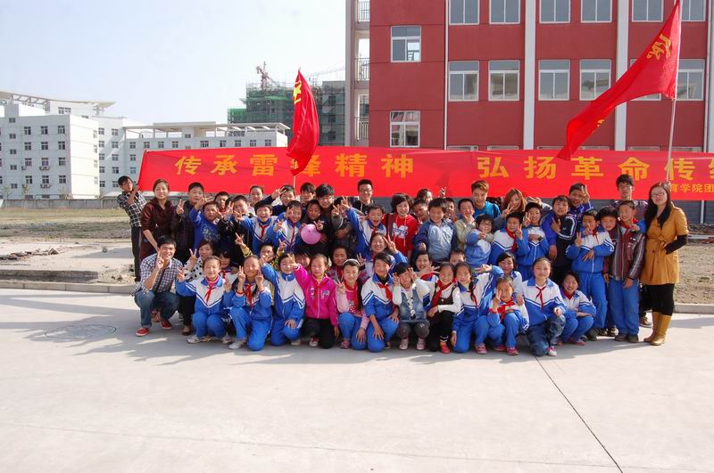 本次活动共包括四个流程。首先我院团总支负责老师向大龙山中心学校的六年级小朋友讲述了本次活动的目的和意义,希望小朋友们向雷锋叔叔学习,早日成长成才,也希望参与活动的我院学生通过本次活动体会到雷锋精神的内涵,并增强社会实践能力。第二项由我院2011级学生陈涛同学向同学们讲述雷锋的感人事迹,解读雷锋的“钉子”精神。在讲故事过程中,大家踊跃发言,现场互动热烈。第三项我院学生代表向全体同学赠送了写有雷锋名言和故事的卡片,并和孩子们进行了面对面的交流探讨。第四项是由我院学生带领六年级的全体小朋友开展素质拓展游戏——“无敌风火轮”,让小学生在实践中学会关爱、帮助、合作和团结。全体同学都兴高采烈地投入到活动中去,活动结束后还分享了活动的经验和感悟,达到了预期的效果。最后,参加活动的师生一起合影留念。