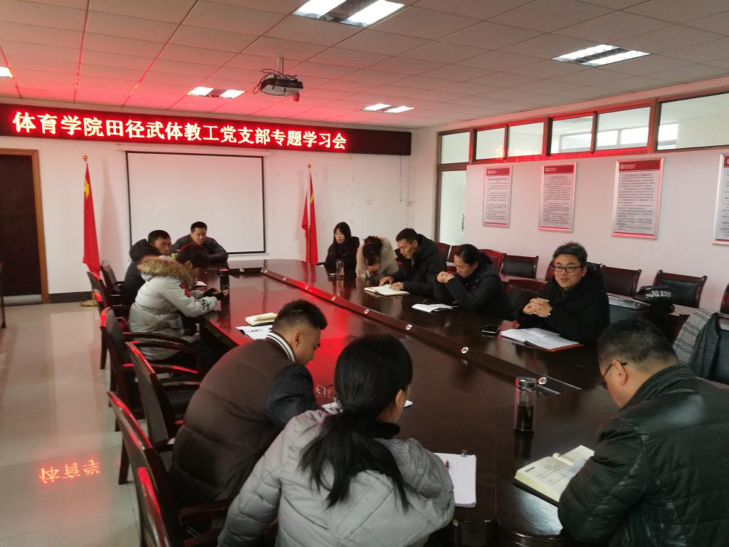 2019年1月2日中午,伟德国际victor·1946源自田径武体教工党支部在学院会议室召开专题学习会,学习习近平主席在庆祝改革开放40周年大会上的重要讲话精神,田径和武术体操教研室的党员教师参加了会议。会议由田径武体教工党支部书记王晓东主持。