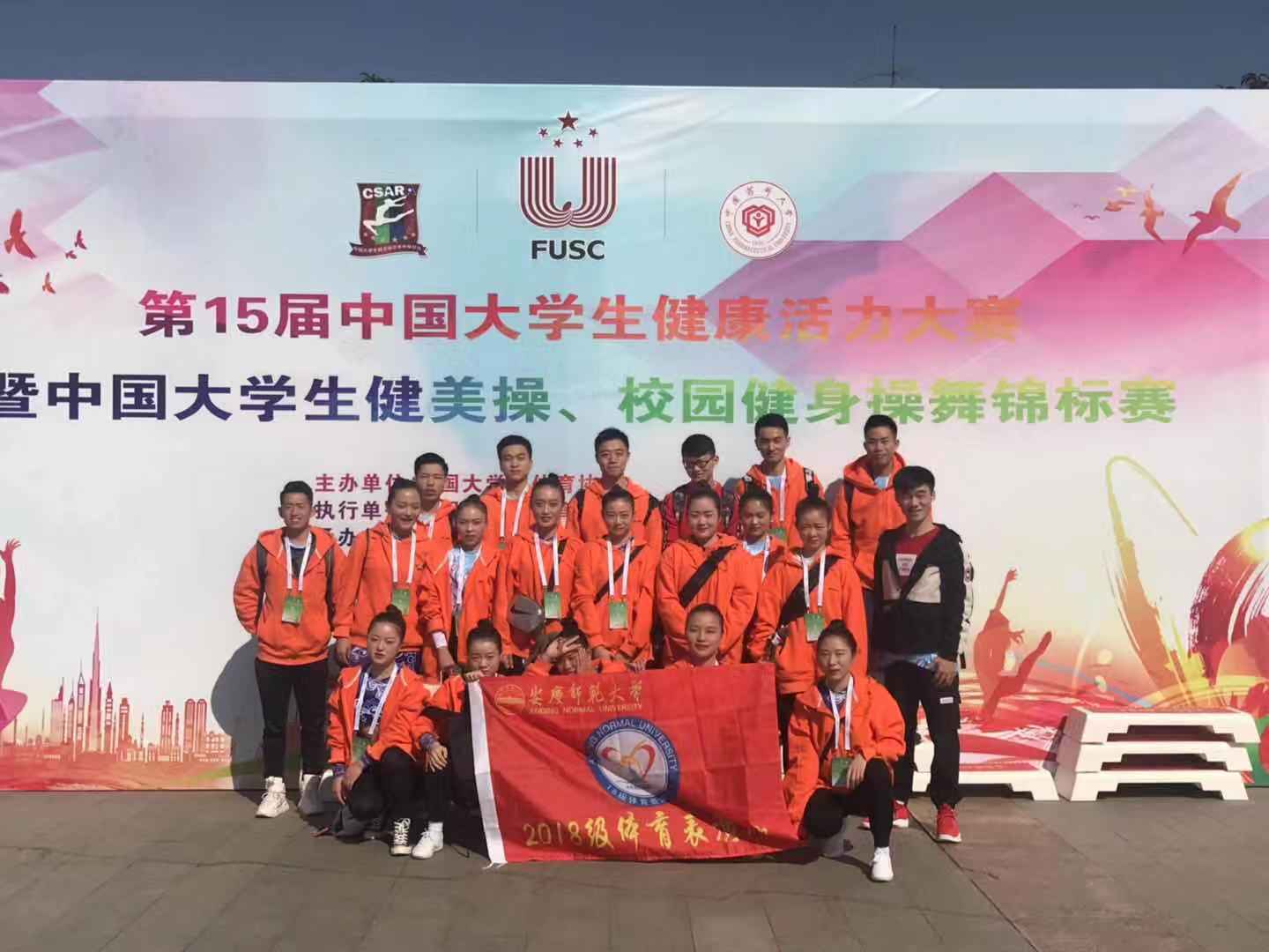 2019年 11月14日至16日,由中国大学生体育协会主办、健美操艺术体操分会执行、中国药科大学承办的“第15届中国大学生健康活力大赛暨中国大学生健美操、校园健身操舞锦标赛”在中国药科大学顺利开赛。bv1946伟德健美操队由伟德国际victor·1946源自副院长林秋菊任领队,在教练员王云辉老师的带领下,齐心协力、奋勇拼搏,最终获得一枚银牌,两枚铜牌的好成绩。