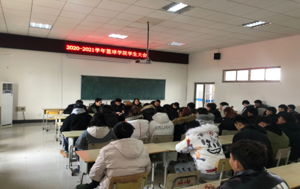 1月7日中午,篮球学院在体育馆多媒体教室召开2020-2021学年度全体学生会议,篮球学院专项教师、辅导员老师、2019级和2020级篮球对口班全体同学参加会议。会议由副院长林秋菊主持。
