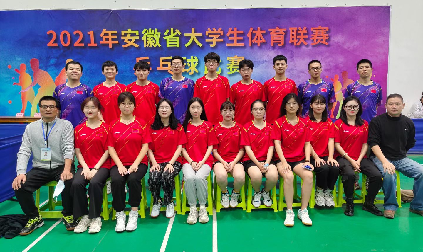 10月31日-11月7日, 2021年安徽省大学生体育联赛乒乓球比赛在淮南师范学院小球馆举行,我校代表队分别参加了甲组和丙组的比赛。