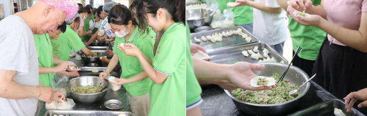 擀皮、切菜、和馅……团队成员们精心采购回到敬老院后,学生们与老人展开了一场“包饺子大赛”。“奶奶,您喜欢吃什么馅的饺子呀?”“爷爷,您看我的饺子包的怎么样?”在包饺子的过程中,老人们也不断向成员们介绍包饺子的“小诀窍”,“手把手”地指导每位成员包饺子的手法和技巧,在包饺子、话家常中拉近了彼此之间的距离。