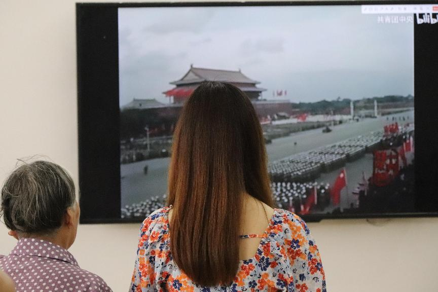 第一面五星红旗在天安门广场上冉冉升起、54门礼炮齐鸣28响、毛泽东宣读《中华人民共和国中央人民政府公告》……学生们还陪同老人观看了1949年开国大典的视频,重温中华人民共和国成立的艰辛道路和中国共产党的艰苦奋斗。