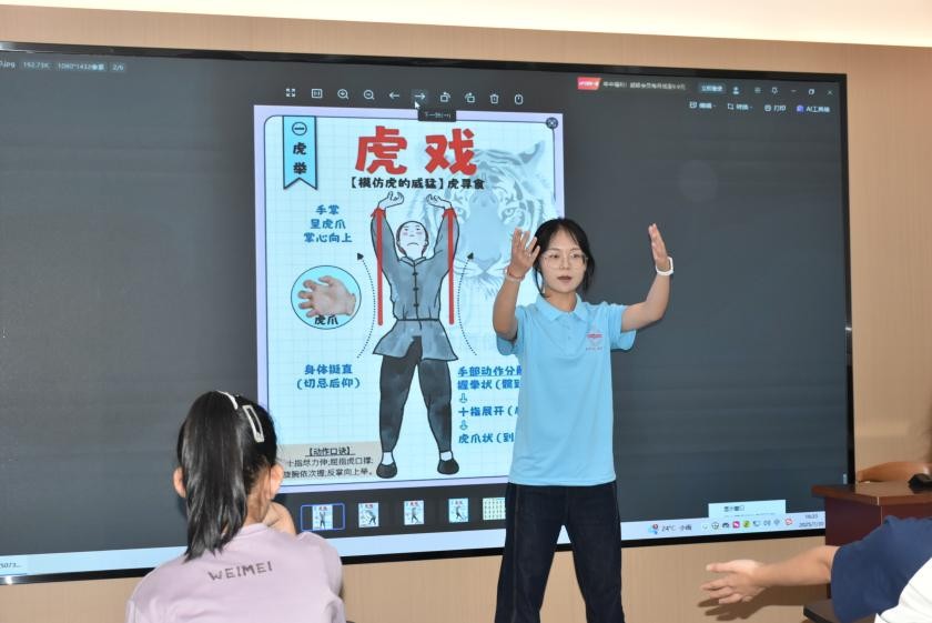 实践团将弘扬中华优秀传统体育文化作为重要使命。运动康复专业2023级周心丽化身 “传统文化使者”,带领孩子们体验五禽戏。课堂上,她结合动画短片与故事,深入浅出地讲述五禽戏的千年传承脉络与养生智慧,阐释虎之威猛、鹿之安舒等文化内涵,并从运动生理学角度解析其对提升柔韧性、协调性、及内脏功能的作用。孩子们沉浸式模仿动作,在锻炼中感受中华传统体育的魅力。