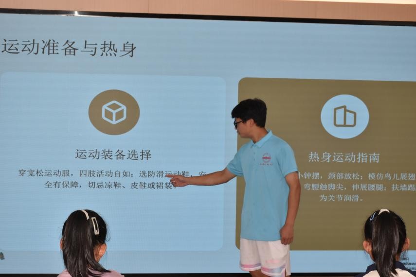 针对基层体育教育资源相对匮乏的现状,实践团开设了“体育知识小课堂”,旨在提升孩子们运动认知素养。体育教育专业2024级(4)班夏康晨用通俗的语言详细讲解篮球、足球等常见运动项目的基本规则、场地要求和安全事项,“踢足球时不能用手碰球哦,就像我们走路不能闯红灯。”用生活举例破除理解障碍。同时,他们还传授运动前热身、中保护、后放松的科学方法,强调循序渐进原则,筑牢孩子们的科学运动理念。