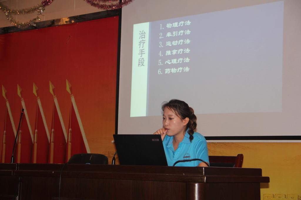 上午九点,在专业指导教师的指导下,同学们组织了一场健康宣讲会。宣讲内容结合实际情况,介绍了高血压、高血糖、高血脂等常见病的一些临床病症,提出了患者在饮食、作息等方面的注意事项,并结合不同病症,给予合适的运动治疗建议。对于人们好发的如肱骨外上髁炎、肩周炎、颈椎病、腰间盘突出等病症,宣讲团成员也介绍了一些自我检查手法和自我运动康复的方法。