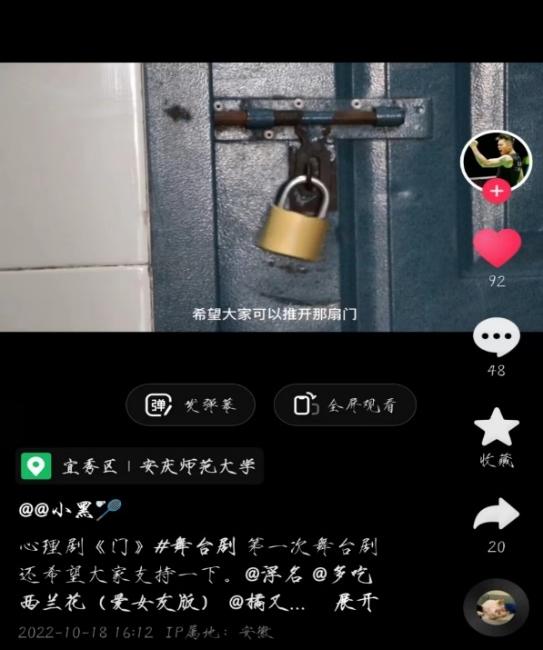 学院组织各班级制作有关心理健康的微视频,进一步做好心理健康知识的宣传和普及。面对镜头,同学们娓娓道来,或是自己的一个小故事,或是为大家讲解一个心理小知识。同学们通过制作心理健康微视频,启发他人心灵,将心理小知识传播给更多的人。体育教育专业2021级6班的徐家乐同学制作了心理微视频作品《门》,在抖音短视频平台上发布,收获一系列点赞和好评。同学们通过微视频的制作与观看,学会用正确的方式调适自己的心理,做健康向上、阳光快乐的新青年。