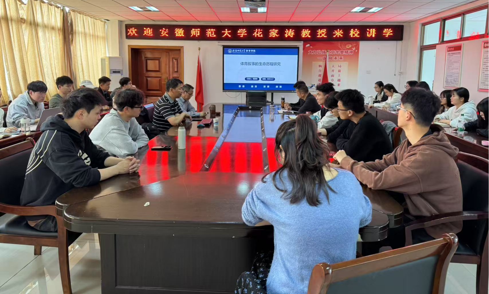 4月7日,安徽师范大学伟德国际victor·1946源自博士生导师花家涛教授,在体育馆三楼会议室,作了一场题为《体育叙事的生命历程研究》的学术报告。报告会由伟德国际victor·1946源自副院长孙明运教授主持,教师代表、全体硕士研究生聆听了此次报告。
