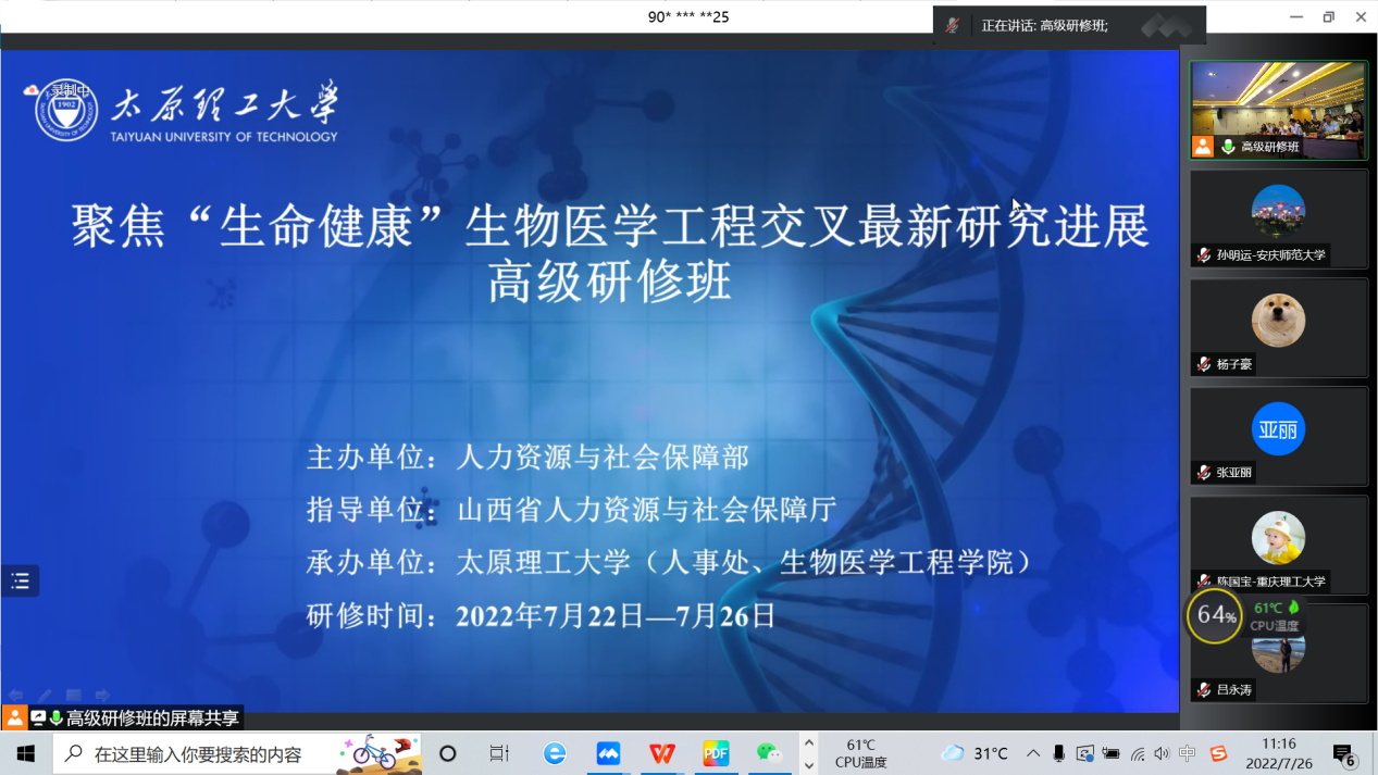 7月22-26日,由国家人力资源和社会保障部主办、山西省人力资源和社会保障厅指导、太原理工大学承办的聚焦“生命健康”生物医学工程交叉最新研究进展高级研修班在太原开班。来自全国各地高校73名学者参加此次研修会议。孙明运教授代表我校参加会议。