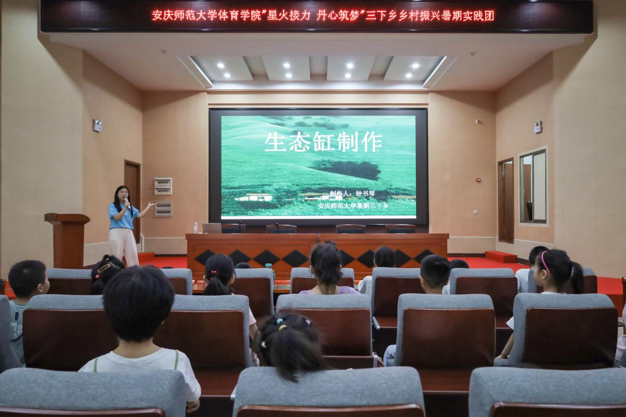 苔藓绿枝,金鱼蚯蚓泥土岩石,这些生产者、消费者、分解者构成玻璃杯里的生态系统主讲人、生命科学学院生物科学专业2023(7)班钟书琴说。7月11日,在铜陵市枞阳县黄镇图书馆里,一群来自bv1946伟德“青·行知”伟德国际victor·1946源自“星火接力,丹心筑梦”乡村振兴暑期社会实践团大学生带领暑期托管班儿童体验制作生态缸,让孩子们在实学习生物知识