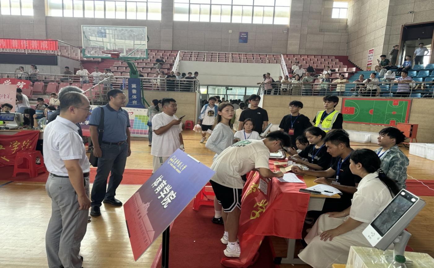 新生报到当天,为保障每一个环节都能高效顺利进行,学院领导、辅导员、志愿者们早早到达现场,检查现场布置情况,沟通工作细节,熟悉工作流程。志愿者们在各自的岗位集结完毕,迎接新生的到来。他们统一佩戴工作证件,亮明的身份标识,分布在校园内的各个迎新区域,为新生提供全方位的引导与帮助。迎新志愿者们用最温暖的笑容和最诚挚的问候,为新生及家长送上了第一份来自学院的关怀。他们不断穿梭在寝室与报到现场之间,帮助新生及家长搬运行李,同时又化身为校园导游,带领新生参观校园,介绍学院文化及校园环境。报到现场,学院领导关怀了解新生报到情况,悉心指导现场工作并亲切慰问了在场志愿者们,他们与新生和家长亲切交流,鼓励新生积极融入大学生活,珍惜宝贵的学习机会。志愿者们分工明确、各司其职,熟练掌握报到流程,引导新生们按照既定流程完成身份核验、登记、发放材料等报到手续,耐心解答他们的疑问,帮助新生们顺利完成入学报到。