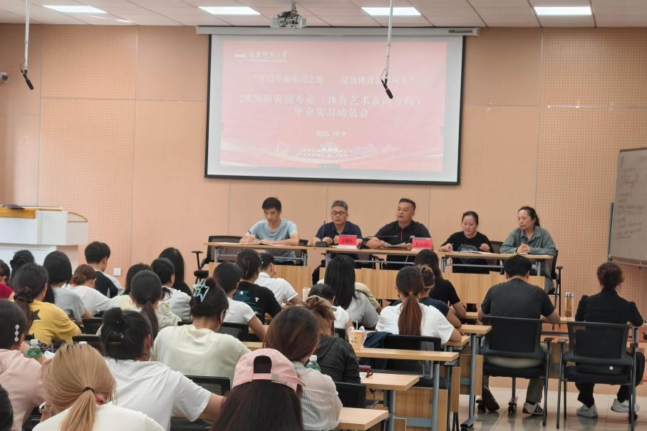 10月9日,伟德国际victor·1946源自在体育馆多媒体教室召开2026届表演(体育艺术表演方向)专业毕业实习动员会议,旨在明确实习任务要求,强调安全纪律规范,部署实习保障措施。伟德国际victor·1946源自副院长王晓东、副书记杜百忍、专业负责人潮芳、专职辅导员沈春华、实习秘书章京京及全体实习指导教师、2026届表演专业实习学生参加会议。