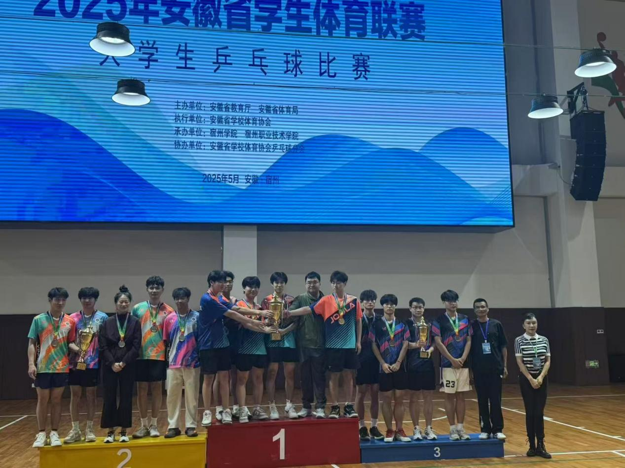5月29日,2025年安徽省学生体育联赛大学生乒乓球比赛在宿州市落下帷幕。本次比赛由安徽省教育厅、安徽省体育局主办,宿州学院和宿州职业技术学院承办,共有来自全省63所高校的400余名运动员参赛。我校乒乓球队由陈国元,黄安泉两位老师担任教练,带队出征,荣获1枚铜牌、1个二等奖、4个三等奖。