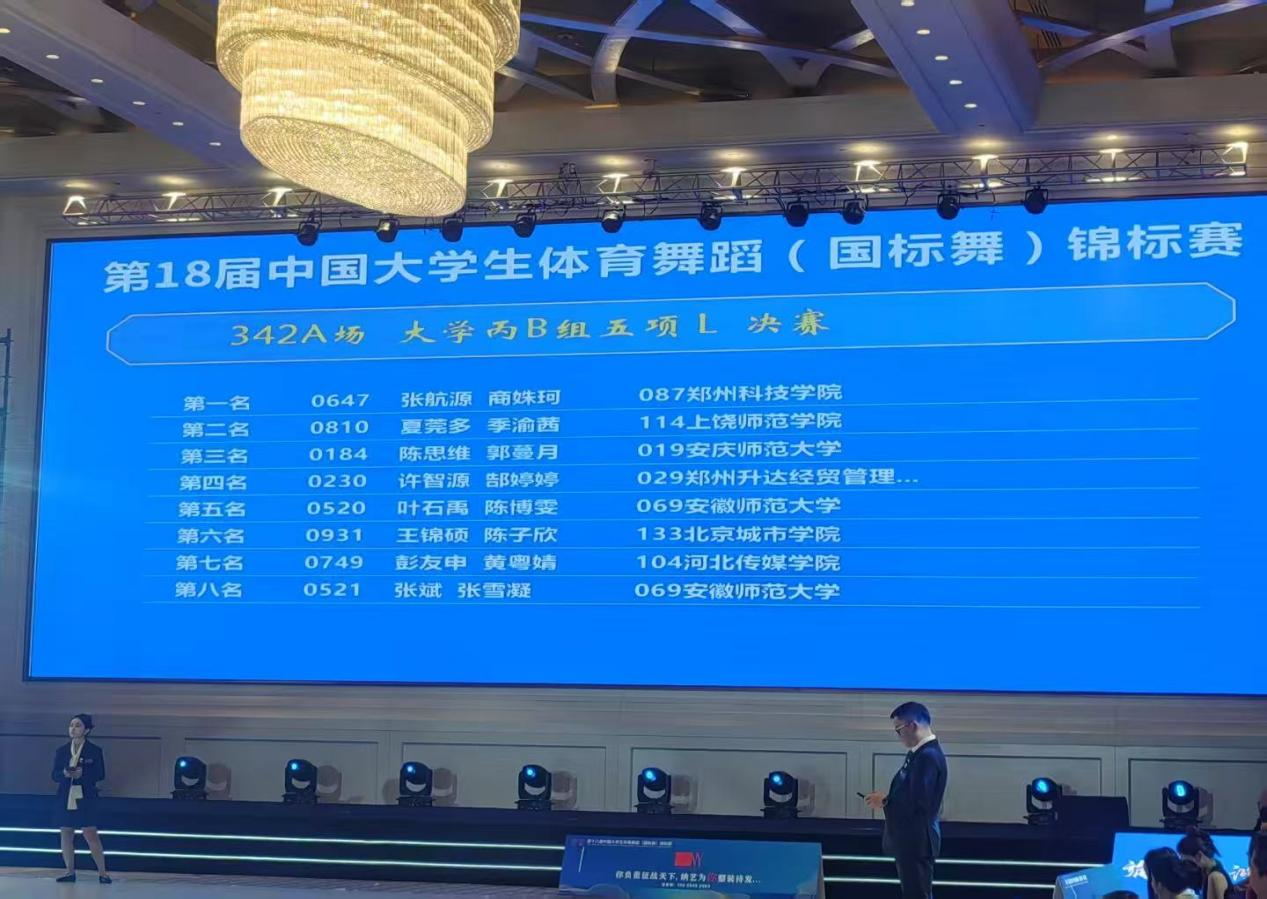 我校体育表演专业6名同学参加比赛,共获得3项二等奖(1个第三,2个第四)的优异成绩,其中在艺考表演招生专业最高组别(丙B组)的五项拉丁比赛中取得第三名的骄人战绩,同时也是安徽省高校在本组别上的最好成绩。
