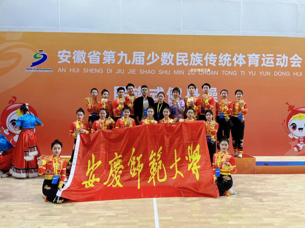 2022年 11月26日至11月30日,由安徽省人民政府主办,安徽省民族事务委员会、省体育局和滁州市人民政府共同承办的第九届少数民族传统体育运动会在滁州市举行。我校36名少数民族运动健儿在许贵泉、张显扬、胡哲纯、潮芳四位教练带领下,参与板鞋竞速、高脚竞速、民族健身操三项比赛,经过5天的激烈角逐,获得1金3银4铜的优异成绩。