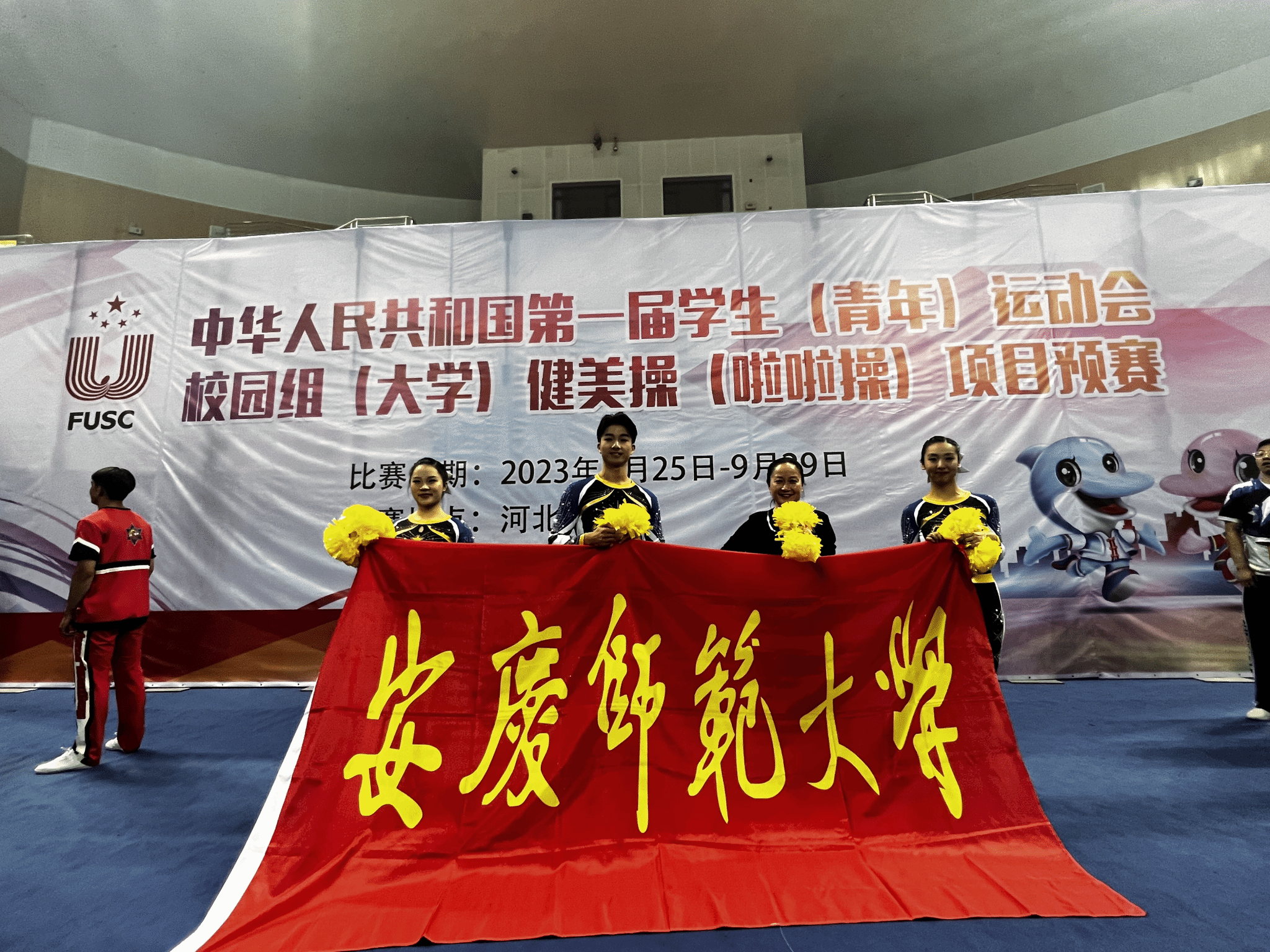 9月23日至30日,由教育部体育卫生与艺术教育司主办的第一届全国学生(青年)运动会大学组啦啦操项目预赛在河北唐山市九江体育中心成功举行。我校3名啦啦操运动员在教练员潮芳老师的指导下,入选安徽省队,代表安徽省出战第一届全国学生(青年)运动会大学组啦啦操项目预赛,全部晋级决赛,为学校赢得了荣誉,为安徽体育增添了光彩。